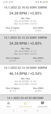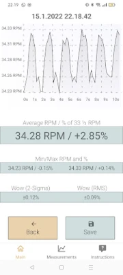 • Vinyl record player speed, including average and minimum/maximum variations. • Wow & Flutter detection for an in-depth analysis of turntable performance.