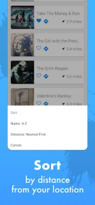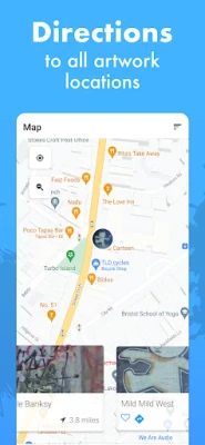 • Interactive location map – pinpointing all Banksy artwork and your location; integrating walking, public transport and driving directions.
