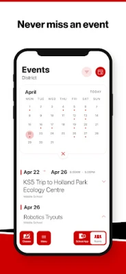 NEVER MISS AN EVENT The event section shows a list of events throughout the district. Users can add an event to your calendar to share the event with friends and family with one tap.