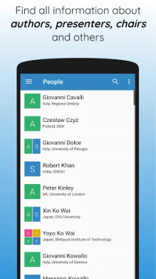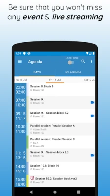 * Access to up to date agenda (workshops, tracks, sessions, speeches, speakers, posters, )