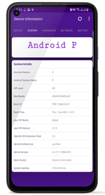 System Specifications: Discover your Android version, Version Name, Bootloader, API Level, Build ID, Build Time, Java VM details, OpenGL info, Kernel Information, Root Access status, and System Up-time.