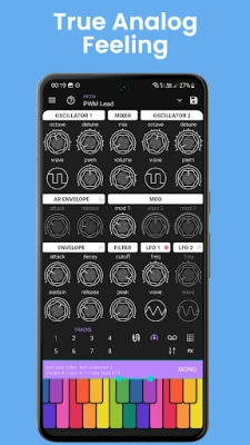 - Advanced Modulation: Two envelope generators (ADSR and AR), two LFOs (SQUARE, SAW, RAMP, SINE, TRIANGLE) that double as oscillators, and a white noise generator.
