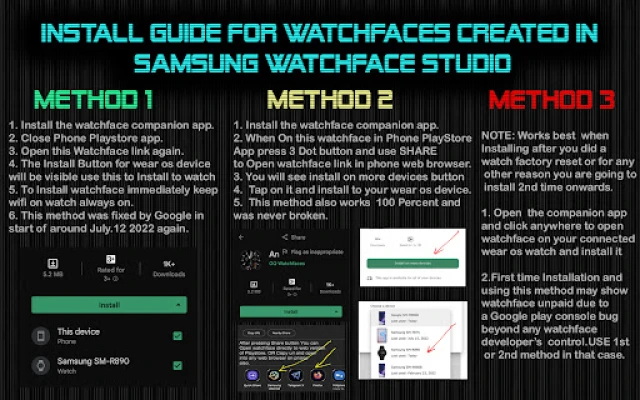 c. An effort also has been made to make a brief install guide as well (an image added with screen previews) .It is the last image in previews of this watch face for newbie android Wear OS users or those who do not know how to install the watch face to your connected device. So it is requested to also make an effort and read it before posting cannot install statements.