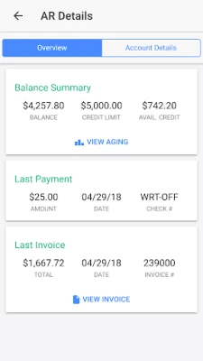 The ability to view provide detailed accounts receivable status is provided including open invoices and payment dates. Information provided includes invoice dates, aging breakdown, invoice numbers, invoice status, invoice amounts, payments, credits, last payment dates and check numbers.