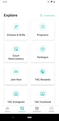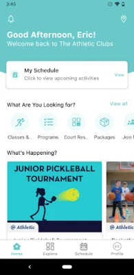 • Receive Club news • Explore classes • Register for programs • Book courts • Check in and track visits • View and edit personal account information • Review charges and make payments